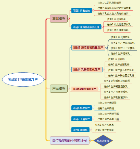 本课程整体设计遵循“成果导向+行动学习”理念,“基于乳品生产岗位工作过程的典型任务”,突出职业技能与岗位需求对接,课程内容分为基础模块和产品模块两部分,基础模块基于乳品生产岗位的通用流程任务:岗前必知、原料乳验收、贮存和运输。这个模块中将从奶源开始进入乳品生产工作场景。产品模块以乳品市场典型产品为载体,突出龙江乳业产品布局特点,以低温奶和配方乳粉为主,基于典型工作任务,以智能化生产的工作过程为主线,学习不同乳制品的加工工艺、质量控制及智能化生产流程,构建“知标准-明工艺- 会操作-懂质控”的岗位核心能力,树立数字化时代乳品加工、乳品质量控制的新工科思维。