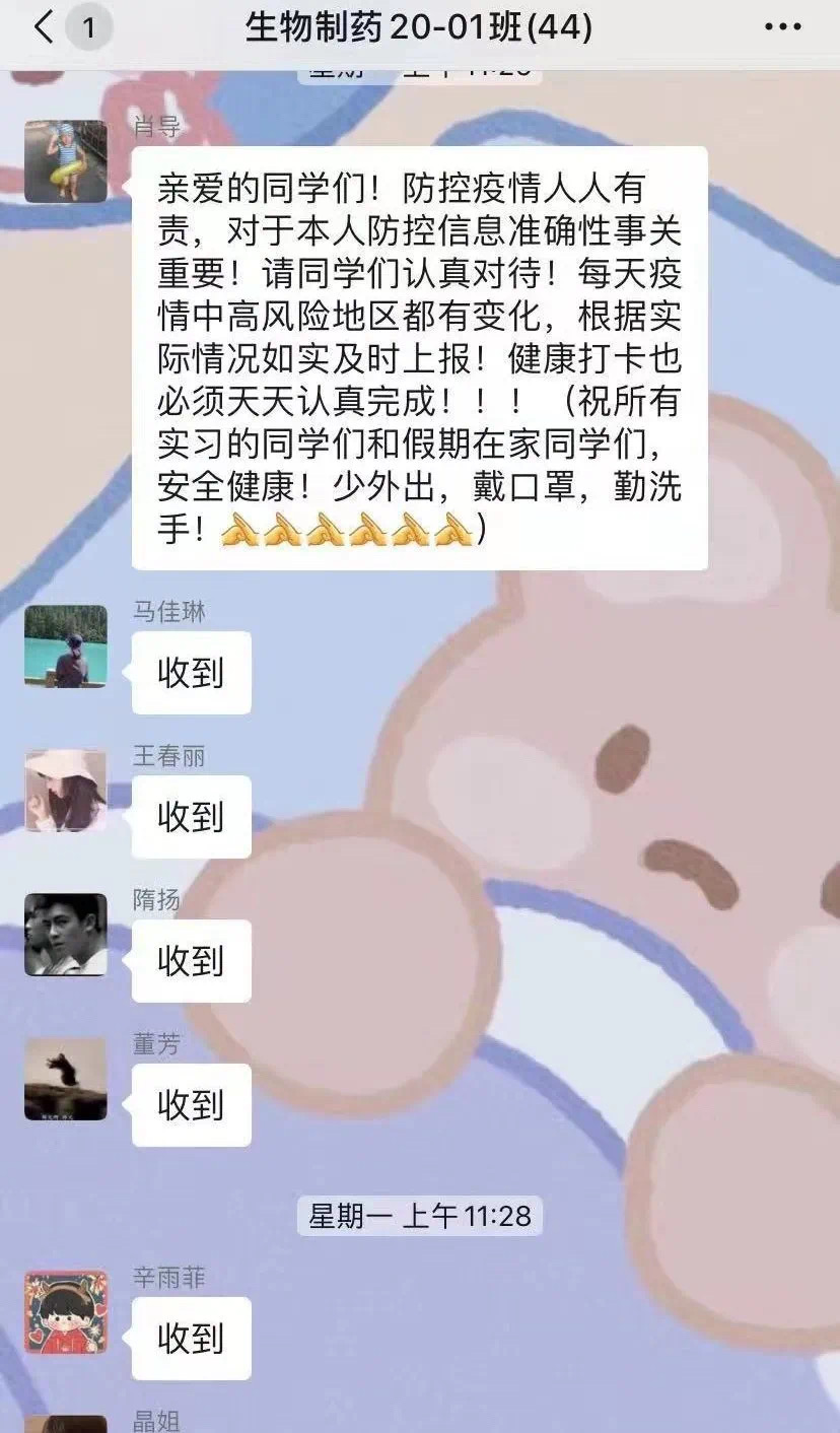 在本次活动中,辅导员通过钉钉会议的形式,组织和监督同学们学习并掌握疫情防控相关知识,引导学生科学看待疫情,树立战疫信心。同时,督促学生做好个人防护,养成少出门、不聚会、勤洗手、戴口罩的好习惯。并在班群中分享相关链接,进一步加强同学们对疫情防控情况的了解。