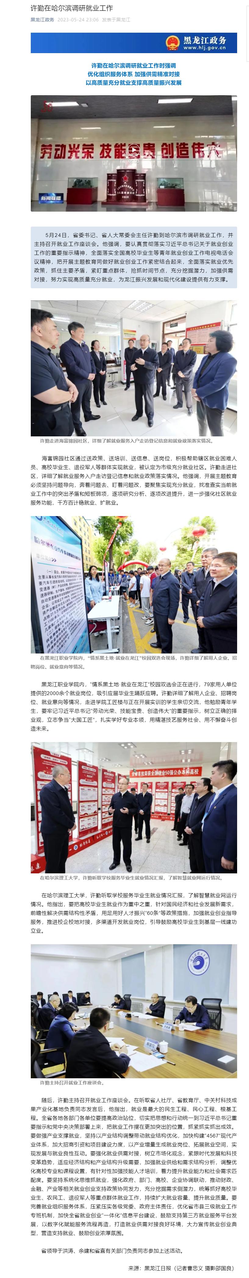 【黑龙江政务】许勤到哈尔滨市调研就业工作