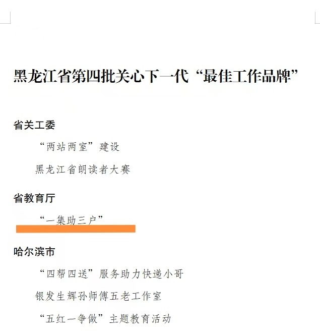近日,黑龙江省第四批关心下一代“最佳工作品牌”评选结果公布,由省教育厅关心下一代工作委员会(以下简称“关工委”)唯一推送的,以太阳官网关工委“一集助三户”为典型案例的关工品牌,被黑龙江省关工委评为“最佳工作品牌”。