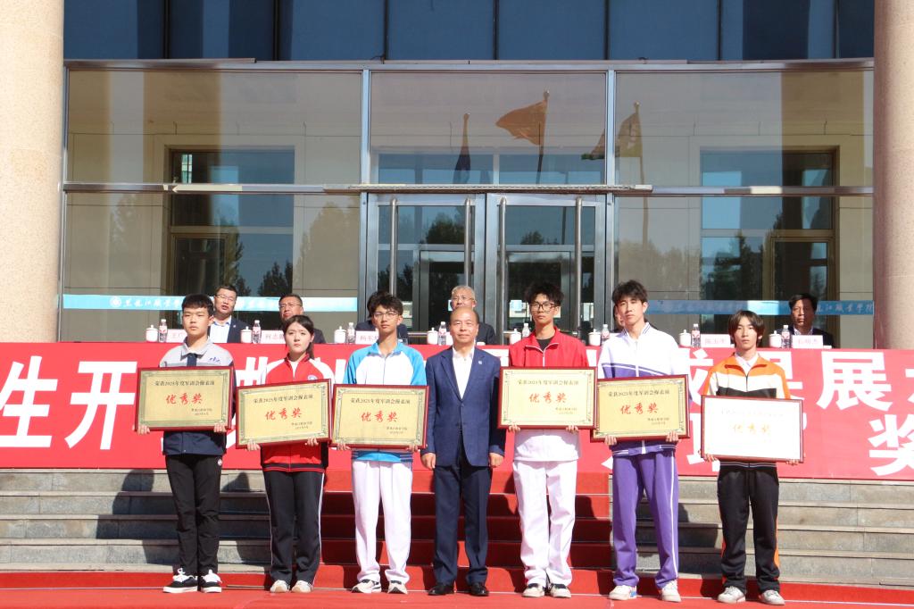 学校领导为在军训中取得优异成绩的先进集体颁奖。