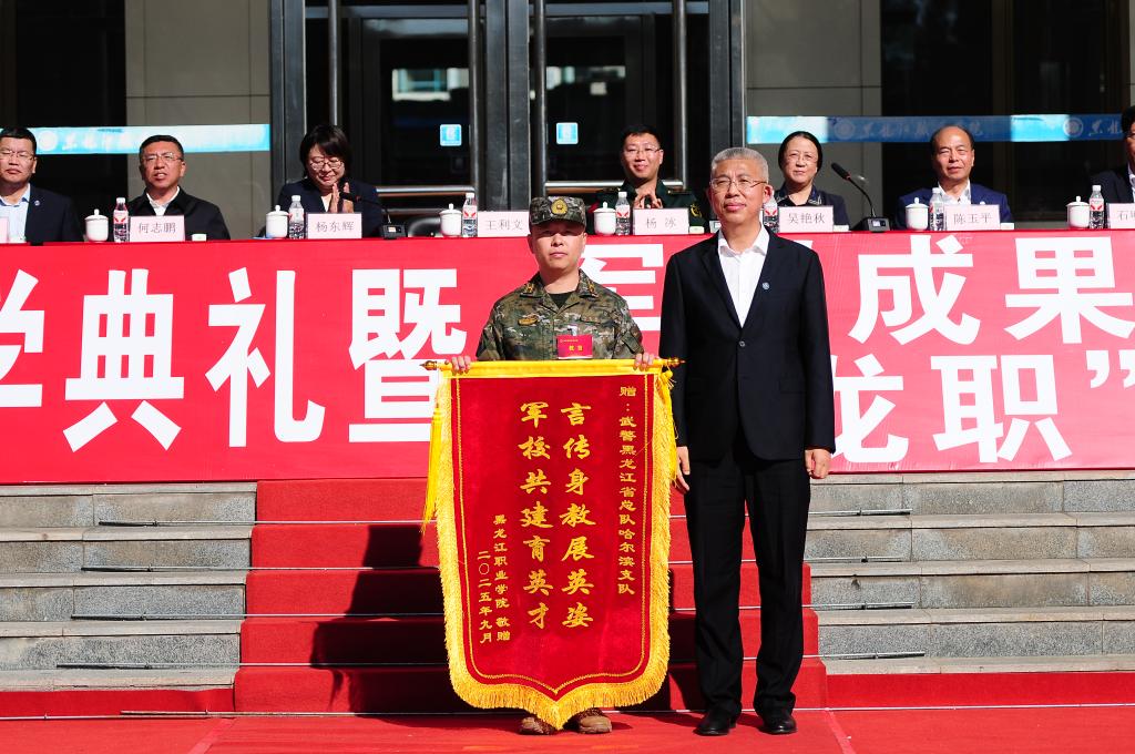 为感谢承训部队多年来对学校军训工作的支持和国防教育做出的贡献,王利文代表学校向承训部队献锦旗,见证双方在协同育人道路上的深厚情谊。
