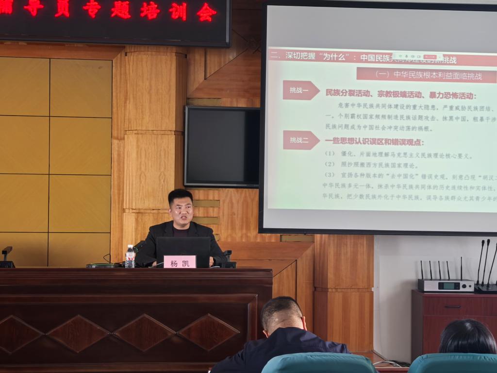 本次培训特邀马克思主义学院思想政治教研室主任杨凯老师担任主讲,围绕“铸牢中华民族共同体意识”这一核心主题,从三个方面进行深入阐释:一是阐释其内涵本质,强调各民族对中华民族的高度认同与精神归属;二是把握其时代必然性,阐明其关乎民族根本利益、复兴伟业、民族关系发展以及党的民族工作新格局;三是探索实践路径,提出从文化认同、经济发展、社会治理等方面协同推进,推动理念落地落实。