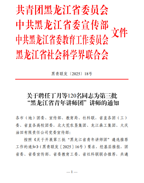 黑龙江省青年讲师团由团省委联合省委宣传部、省委教育工委及省社科联共同遴选组建的,核心使命是坚持用习近平新时代中国特色社会主义思想武装青年、教育青年,重点围绕习近平总书记重要讲话重要指示和党的二十大和二十届历次全会精神,习近平总书记关于青年工作的重要思想等开展宣讲,加强体系化、学理化阐释,深刻领悟“两个确立”的决定性意义,增强“四个意识”、坚定“四个自信”、做到“两个维护”。通过一场场基层宣讲让 “请党放心,强国有我” 的青春信念深深扎根青少年心中,为黑龙江高质量振兴发展凝聚青年力量。
