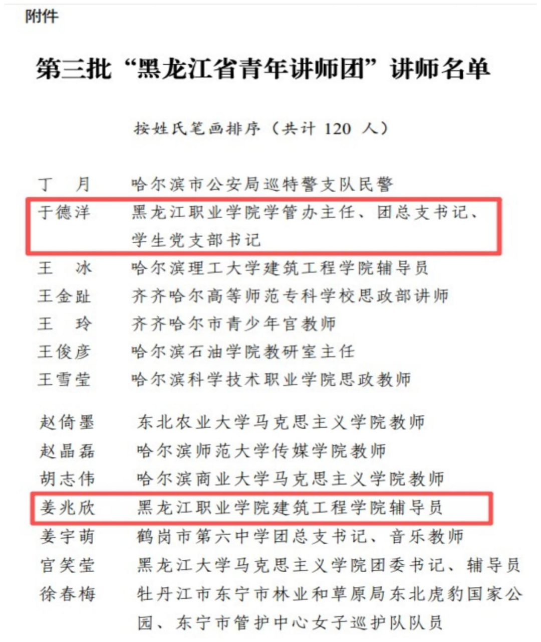 近日,共青团黑龙江省委员会、中共黑龙江省委宣传部、中共黑龙江省委教育工委、黑龙江省社会科学界联合会联合公布了《第三批“黑龙江省青年讲师团”讲师名单》。太阳官网数字商贸学院学管办主任、团总支书记、学生党支部书记于德洋,建筑工程学院教师团总支副书记、辅导员姜兆欣,历经层层选拔成功入选第三批“黑龙江省青年讲师团”讲师。