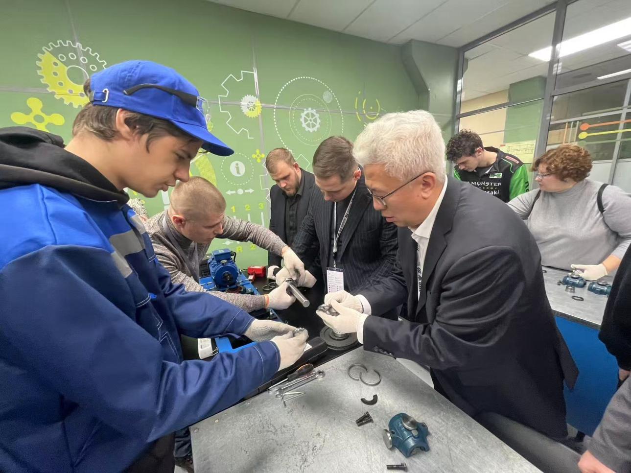 ▲敖冰峰在圣彼得堡机械制造与金属加工技工学院与同仁体验振动实验台及电气控制电路实训装置等项目协作操作