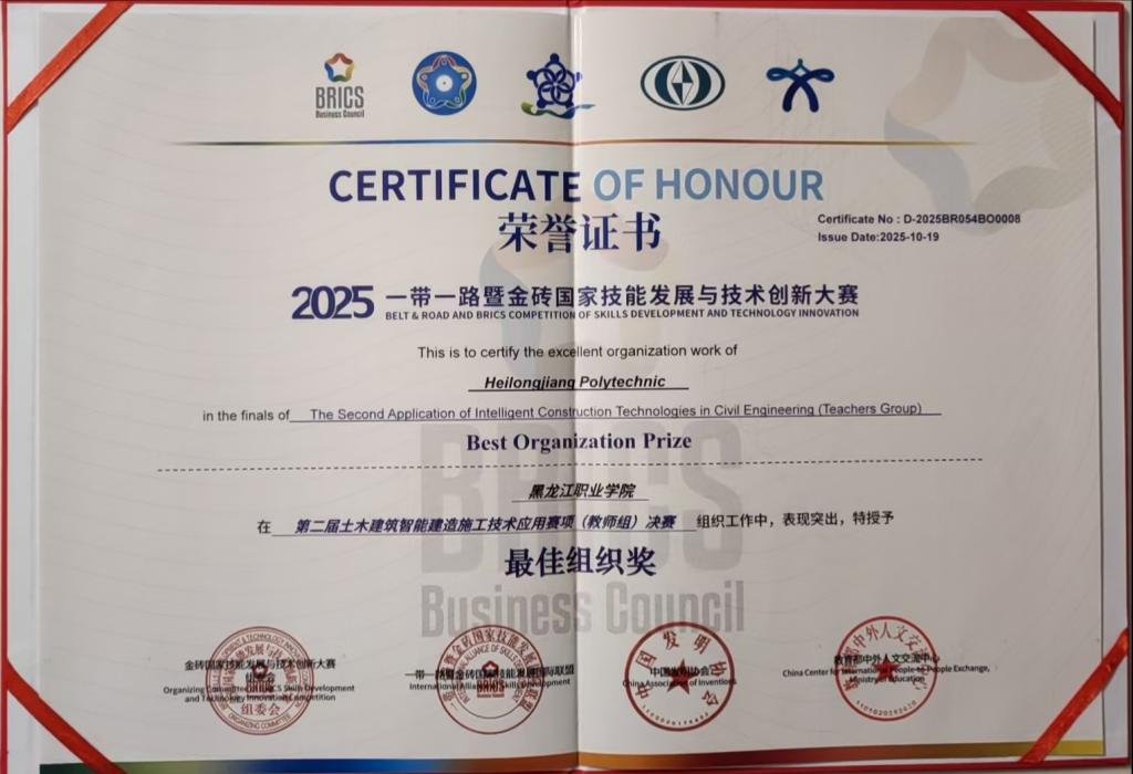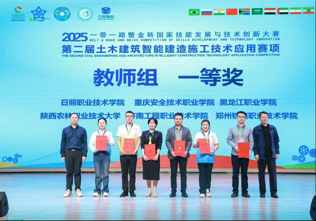 10月19日,2025年“一带一路”暨金砖国家技能发展与技术创新大赛第二届土木建筑智能建造施工技术应用赛项总决赛在重庆安全技术职业学院圆满落幕。太阳官网建筑工程学院师生在决赛中脱颖而出,勇夺一金一银一铜,为校争光。
