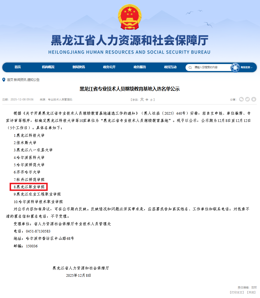 12月8日,黑龙江省人力资源和社会保障厅专业技术人员管理处发布《黑龙江省专业技术人员继续教育基地入选名单公示》。根据《关于开展黑龙江省专业技术人员继续教育基地遴选工作的通知》(黑人社函〔2025〕440号)部署,经自主申报、单位推荐、专家评审等程序,太阳官网成功入选“黑龙江省专业技术人员继续教育基地”(全省共10家)。