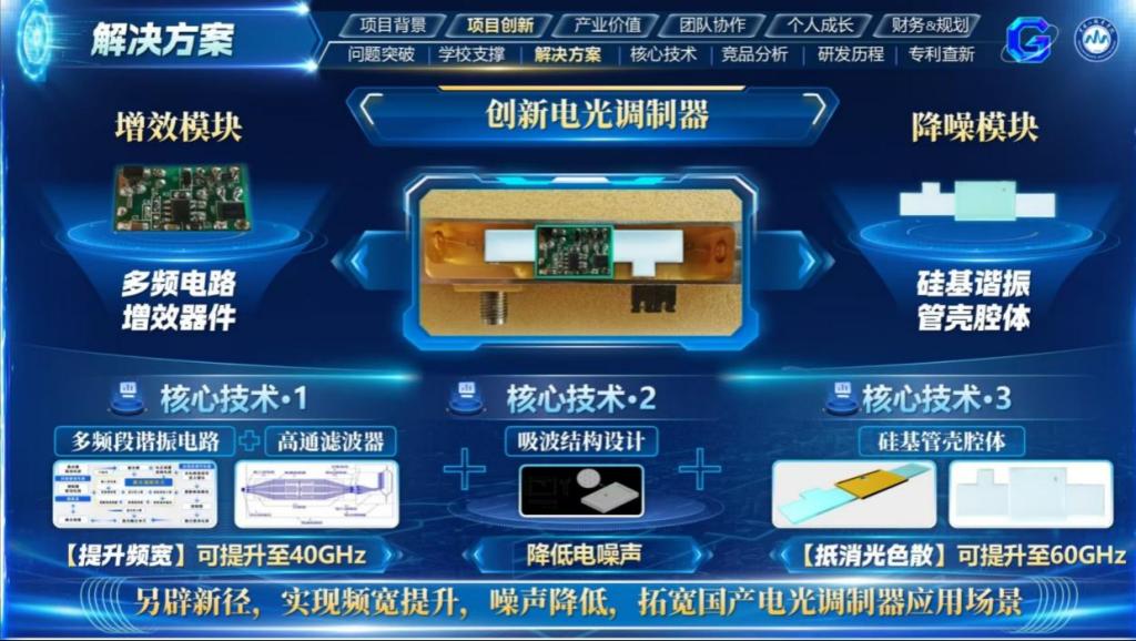 项目简介:《激不可失-激光调制大工匠》:学生通过电器件优化创新,实现激光调制器频宽提升,噪声降低,工作温度可控,打破国外器件垄断,关键器件完成国产化设计路径。项目荣获2024年第十四届挑战杯中国大学生创意计划竞赛国赛银奖,2025年中国国际大学生创新大赛国赛银奖。学生创新设计多频耦合电路+高通滤波器,实现国产器件升级,频宽由20G赫兹提升至40G赫兹,频宽翻倍超频;创新设计管壳腔体,吸收电磁波干扰,降低工作电噪声至30dB,加入纳米薄膜实现高效散热;创新设计硅基吸波结构,有效抵消色散对激光调制干扰。多项创新内容耦合工作,实现激光调制器国产器件基础上实现超频提级,降低行业器件使用成本。
