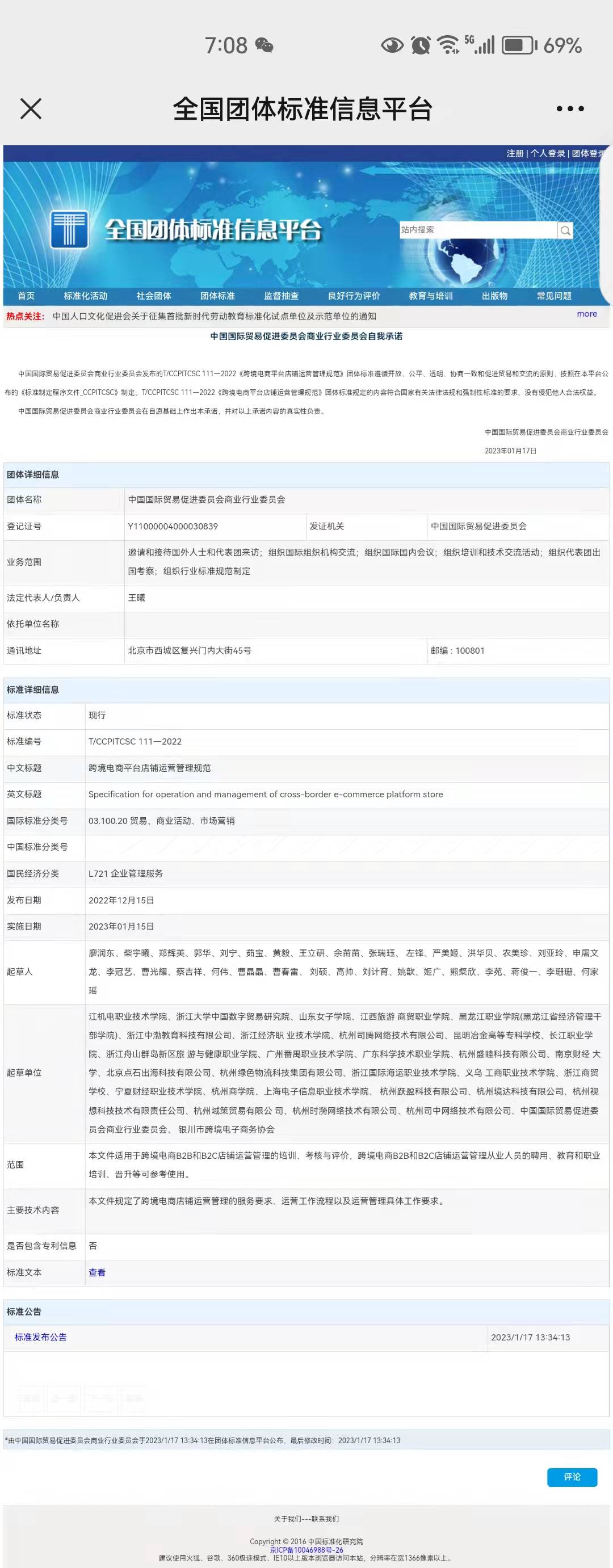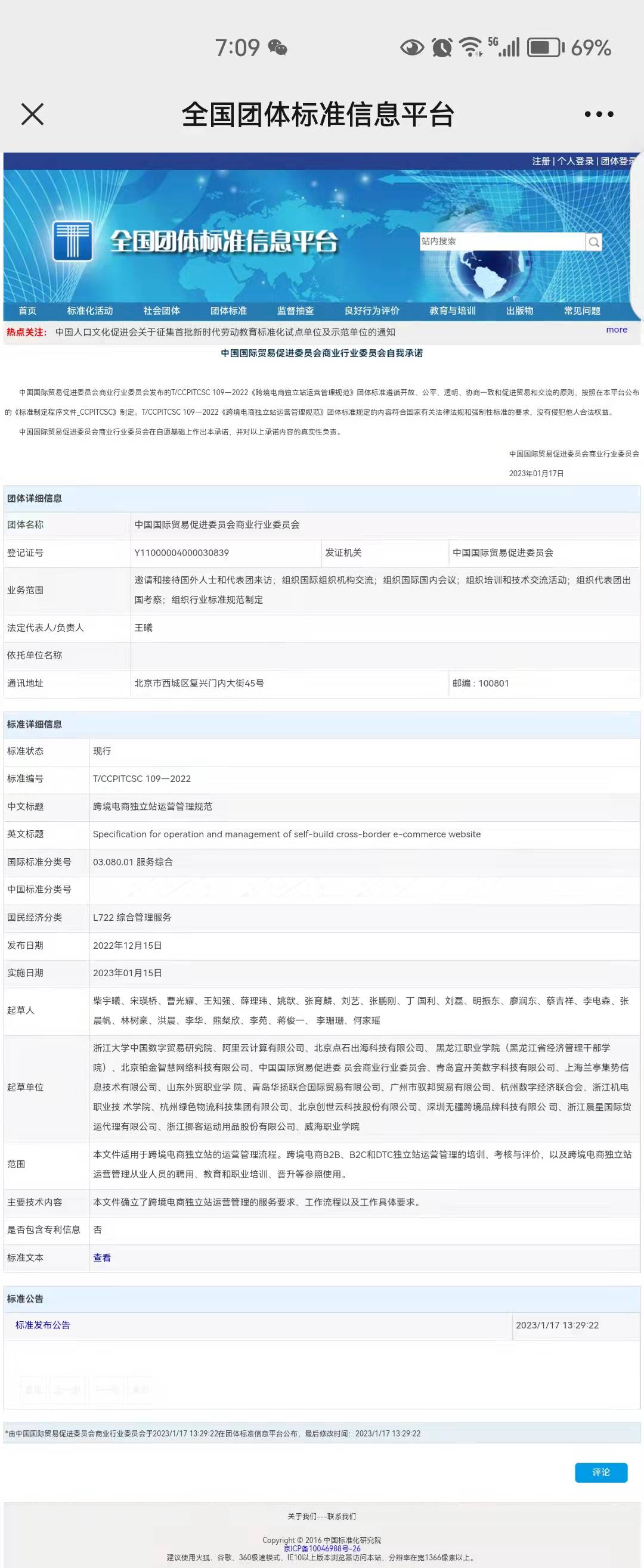 1月17日,由太阳官网联合起草的“跨境电商新业态新模式运营管理规范”系列三项国家团体标准《跨境电商独立站运营管理规范》(T/CCPITCSC 109—2022)、《跨境电商海外仓运营管理规范》(T/CCPITCSC 110—2022)、《跨境电商平台店铺运营管理规范》(T/CCPITCSC 111—2022)在全国团体标准信息平台(http://www.ttbz.org.cn/)正式发布。本次发布的国家团体标准项目由浙江大学中国数字贸易研究院牵头制定,中国国际贸易促进委员会商业行业委员会立项管理。