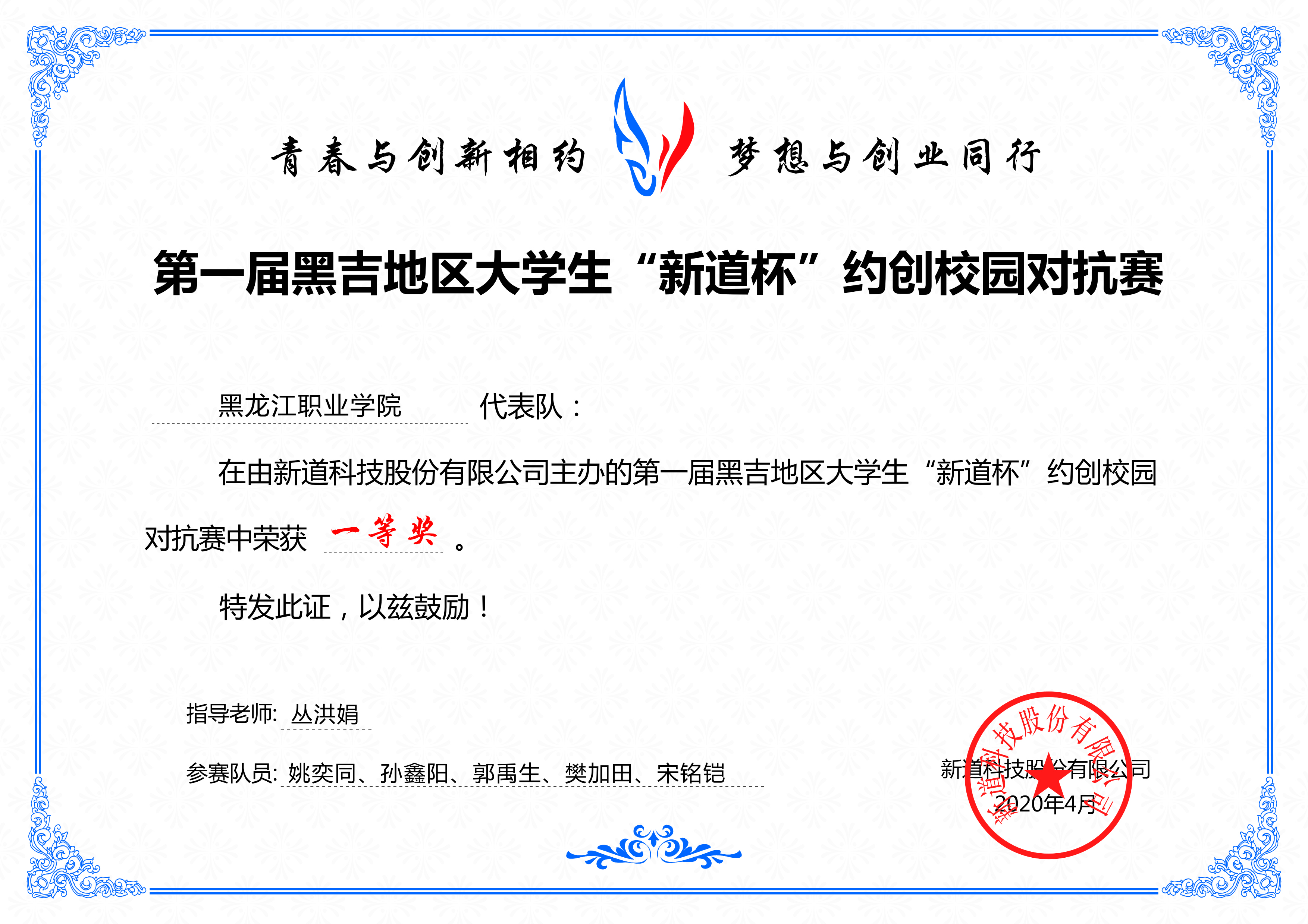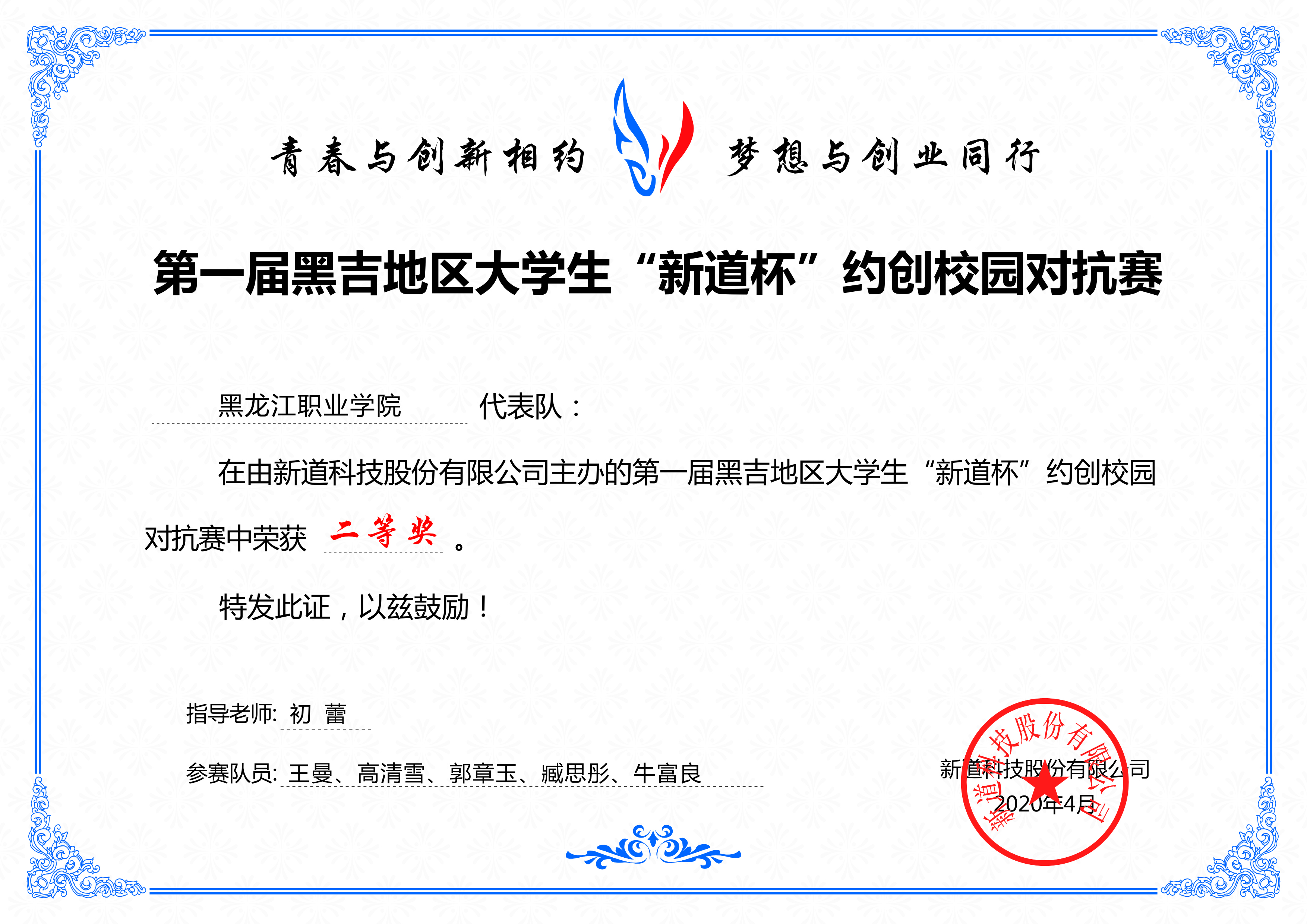 近日,新道科技股份有限公司主办了第一届黑吉地区大学生“新道杯”约创校园对抗赛。本次大赛由来自黑吉2省,11所院校,16支代表队的精英参赛。比赛分四轮,以网上比赛的方式进行,每轮比赛按照排名积分,最后按照总积分进行最终排名。工商管理学院丛洪娟指导的龙职一队,参赛学生:姚奕同、孙鑫阳、郭禹生、樊加田、宋铭铠获得一等奖;初蕾指导的龙职二队,参赛学生:王曼、高清雪、郭章玉、臧思彤、牛富良获得二等奖。